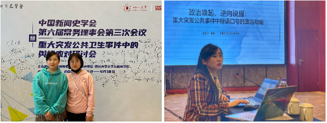 2021年4月17日—4月18日,中国新闻史学会第六届常务理事会第三次会议暨重大突发公共卫生事件中的舆情应对研讨会在成都召开,此次会议由中国新闻史学会主办,四川大学文学与新闻公司承办。公司教师郭淼、研究生檀晓涓参会,并作题为《政治唤起与逆向说服:重大突发公共卫生事件中标语口号政治功能》的交流发言。