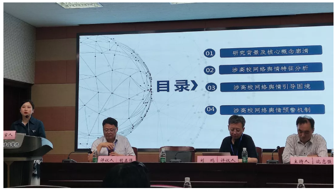 公司教师郭淼在第一分会场进行了题为《涉高校网络舆情预警机制研究》的学术报告,会议主持人是《传媒观察》杂志社主编沈志强,评议人分别是《新闻记者》杂志主编刘鹏,南京师范大学新闻与传播公司教授、博士生导师胡正强。郭淼老师分别从选题缘起、核心概念廓清、涉高校网络舆情特征分析、引导困境和预警机制五个方面进行了汇报。沈志强主编充分肯定了论文的选题角度和研究价值。胡正强教授肯定了论文的研究思路和整体结构,他认为,高校网络舆情预警机制是高校必不可少的一环,明确了建立预警机制的必要性,高校需要认真研究,制定具体可行的舆情预警方案。
