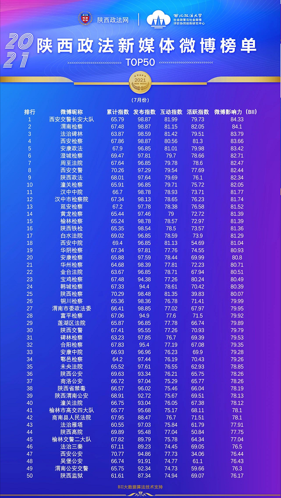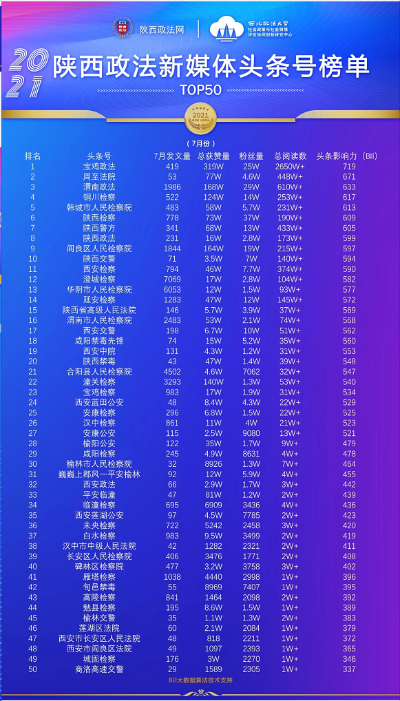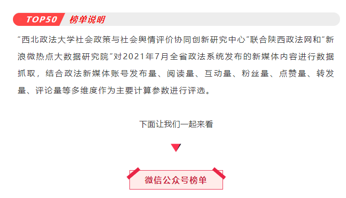本期陕西政法新媒体账号榜单有5个,即:微信公众号榜单、微博榜单、头条号榜单、视频类榜单、资讯类账号榜单。