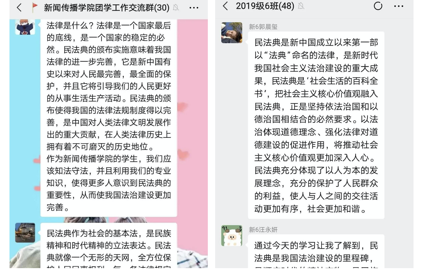 身为新传学子,我们应认真学习并宣传《民法典》内容,充分利用政法院校的优势,对《民法典》进行系统、深入的学习,为以后的学习、工作做好准备。