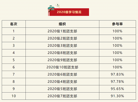 在上一期“青年大学习”网上主题团课的学习中,2020级1、2、3、8、9、10班团支部位居榜首。
