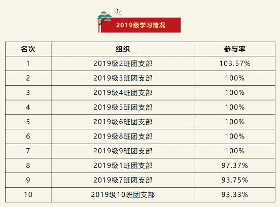 在上一期“青年大学习”网上主题团课的学习中,2019级2班团支部位居榜首,2019级3、4、5、6、8、9班团支部排名第二。