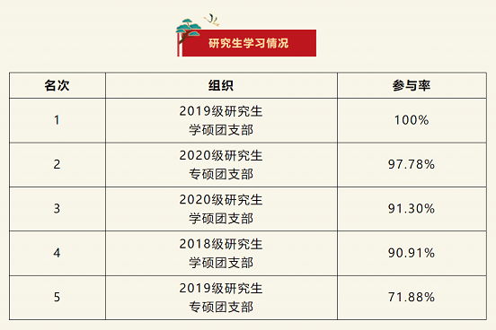 在上一期“青年大学习”网上主题团课的学习中,2019级研究生学硕团支部位居榜首,2020级专硕团支部排名第二,2020级学硕团支部排名第三。