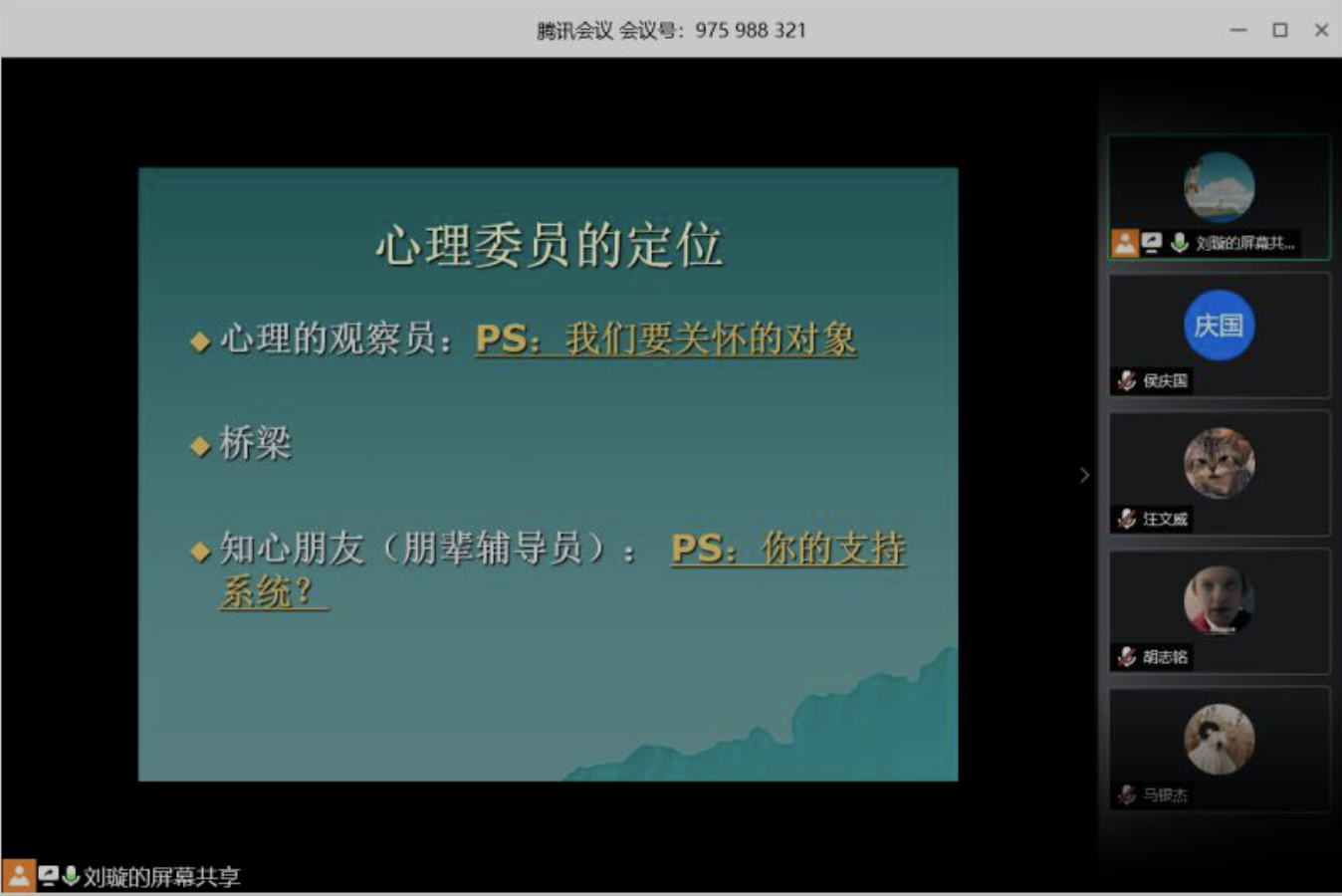 为认真落实公司第十二届心理健康教育暨第八届诚信教育宣传季系列活动有关要求,结合疫情期间实际情况,2020年5月14日公司心理辅导员刘璇老师为公司2018级、2019级心理委员进行线上培训。