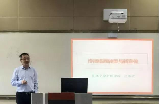 6月6日早8点,复旦大学新闻公司执行经理张涛甫老师在公司北区录播教室为同学们进行了题为“传播转型与新宣传”的讲座,本次讲座由柯泽老师主持。