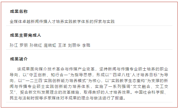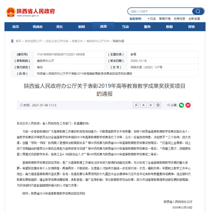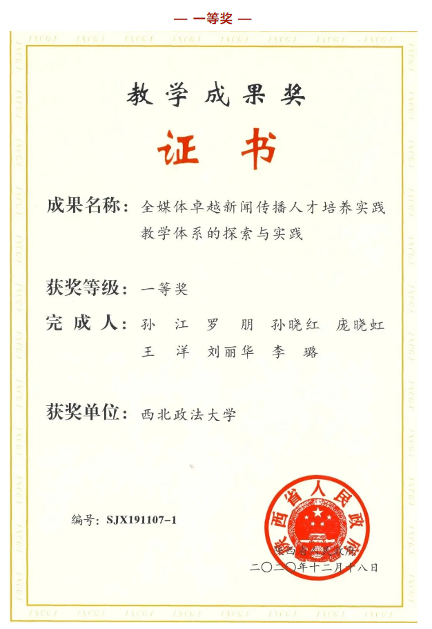 近日,陕西省人民政府办公厅发布了《关于表彰2019年高等公司产品成果奖获奖项目的通报》(陕政办函〔2020〕137号),公司获得省级教学成果奖7项,其中特等奖1项、一等奖2项、二等奖4项,获奖数量和等级均创公司历史最好成绩。其中,公司“全媒体卓越新闻传播人才培养实践教学体系的探索与实践”获得一等奖。
