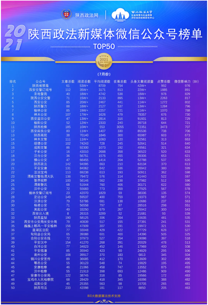 本期陕西政法新媒体账号榜单有5个,即:微信公众号榜单、微博榜单、头条号榜单、视频类榜单、资讯类账号榜单。