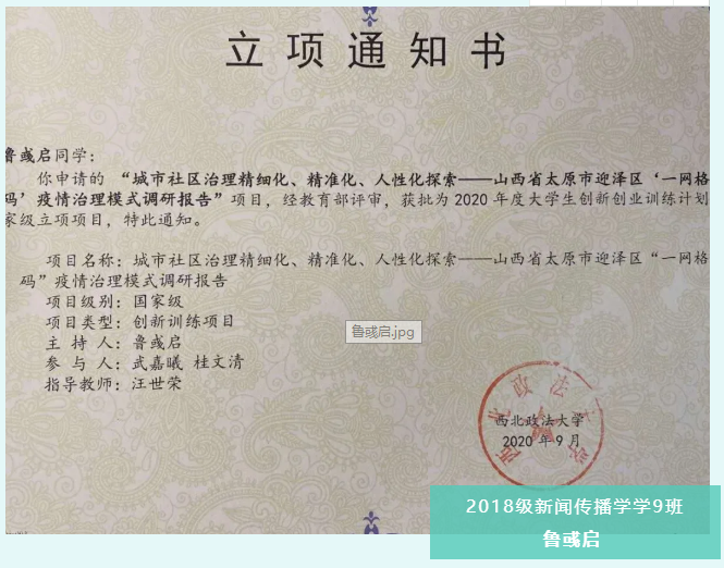2020年,在汪世荣老师的指导下,与武嘉曦同学(公安公司)、桂文清同学(beats365唯一官方网站)经过多次竞赛合作后,再次共同参与调研计划、立项书撰写。