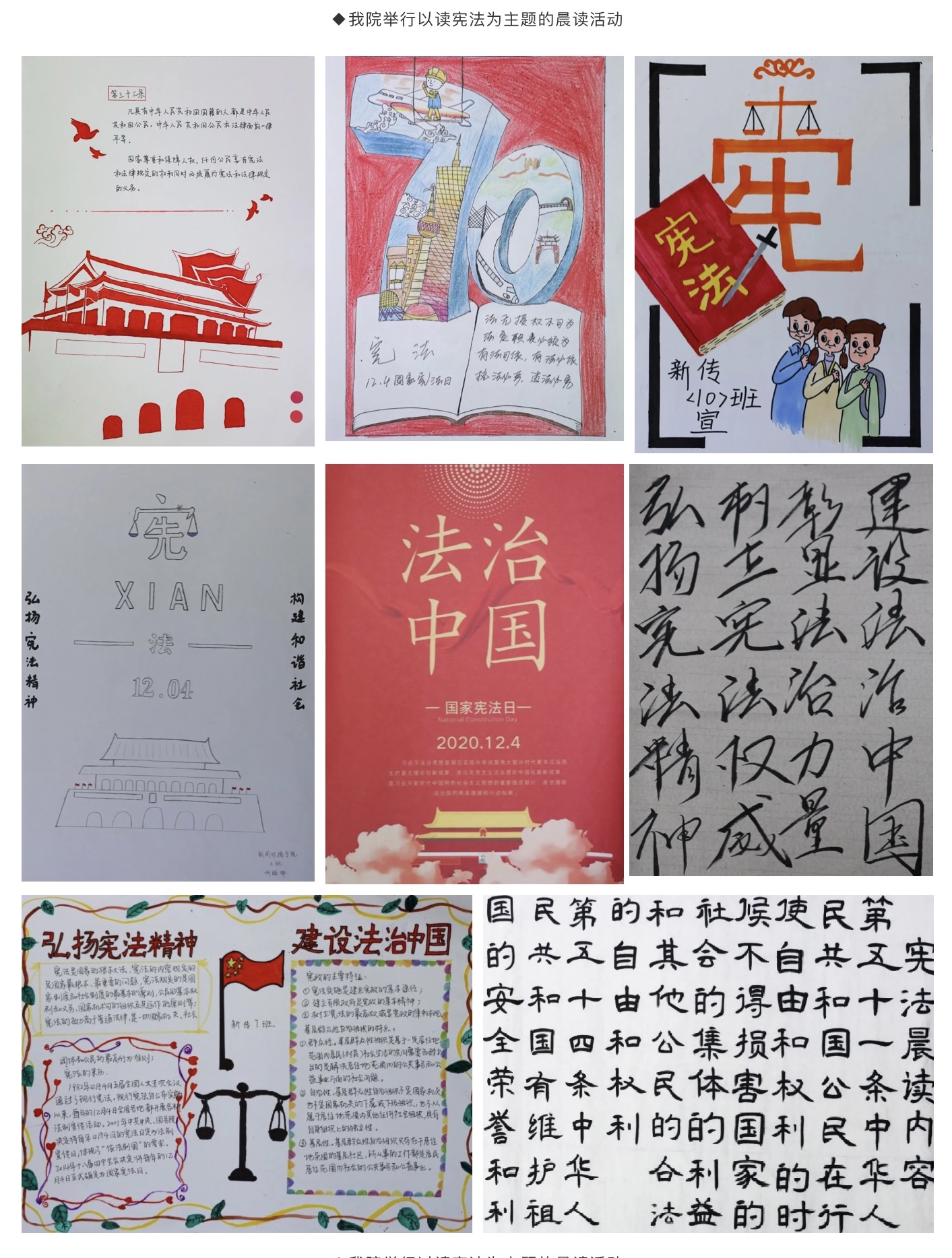 “中华人民共和国是工人阶级领导的、以工农联盟为基础的人民民主专政的社会主义国家。”公司2020级在12月4日当天开展以读宪法为主题的晨读活动,组织师生朗诵宪法原文,体悟宪法精神,增强法治观念。围绕宪法宣传主题,在同学中征集手抄报、书画、电子海报等作品,创新学宪法形式,让宪法学习活动生动鲜活起来,提升宣传效果。