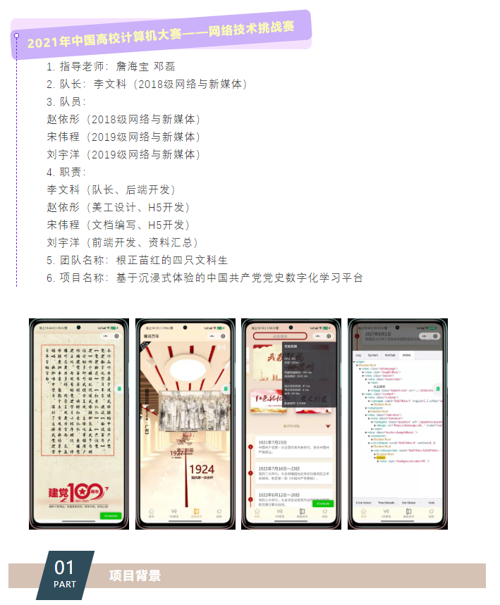 2021年是中国共产党成立100周年,为了更好地庆祝这一伟大历史事件,参赛团队不断地强调“学党史,强信念,跟党走”这一重要理念。在互联网新技术条件下,为了更好地学习党史,讲好党的故事,团队最终选择学习红色党史文化作为本次参赛项目的主题,同时这也贴合西法大这一具有深厚红色历史文化底蕴的公司的优良传统。团队在创作过程中选择使用可交互的H5形式制作融合互动作品,同时根据赛项要求,将小程序开发作为主体应用,因此团队项目名称取做“基于沉浸式体验的中国共产党党史数字化学习平台”。