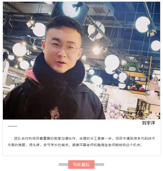 2021年的这一次比赛,团队有了第一次作品创作的相关经验,自己也加强了前端相关知识的学习,使得这一次我们团队能够以非常高速度、高质量的完成各个环节的任务,包括前期需求文档、前端美工、后端设计等各个方面。作为网络与新媒体专业的我们,也正是通过这次比赛的机会,能够展现我们所学的技能,将课堂所学贯彻到实践创作中来。在比赛中幸有指导老师的指点,我们能够清楚地看到自身的不足,看到自己要努力的方向和目标。同时也通过这次团队合作有幸认识非常棒的学弟学妹,希望以后有机会能再次合作。