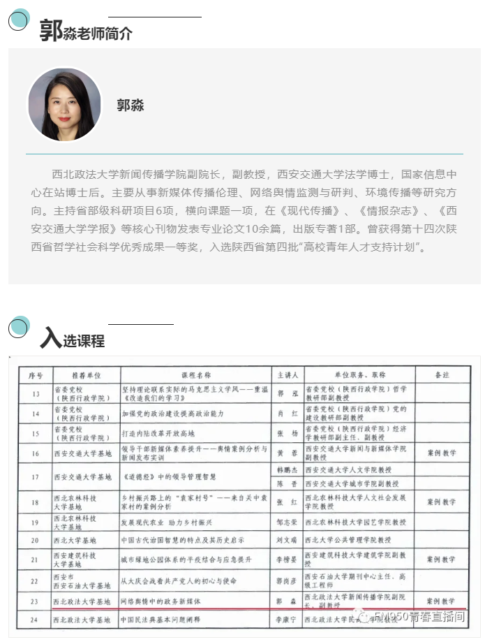 近日,全省干部教育培训好课程推荐目录发布,beats365唯一官方网站郭淼老师申报的《网络舆情中的政务新媒体》课程成功入选该推荐目录。