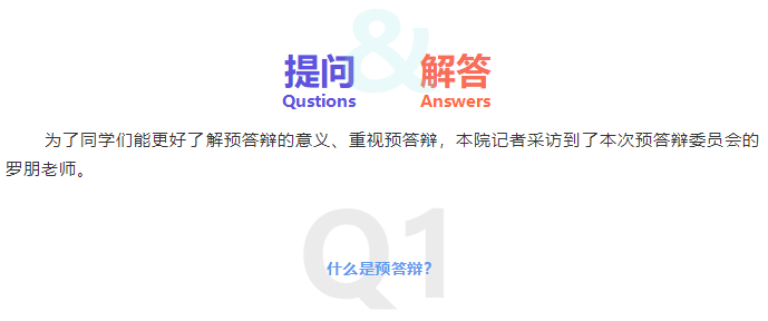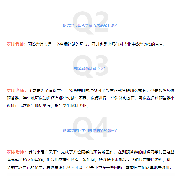 罗朋老师:预答辩就是在对毕业生进行的答辩资格审查。预答辩的程序和要求与正式答辩基本一致,答辩组老师会审核毕业生的毕业论文或设计作品,判断其选题和内容是否达标,通过预答辩的毕业生可以参加之后的论文查重,查重合格后才可以参加正式的毕业论文(设计)答辩。预答辩目的是为了让大家更加清楚地了解毕业答辩的完整流程,也让老师们对员工论文进行前期检查,提出修改意见,督促员工进一步完善自己的毕业论文或设计,以保证正式答辩的顺利进行。