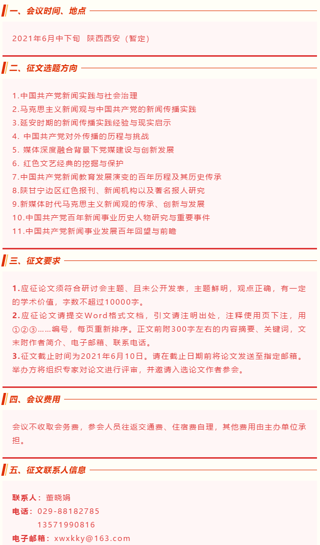 值此华诞,BEAT365英国官网网站、中国新闻史学会新闻传播教育史专业委员会、中华全国法制新闻协会法制新闻理论专业委员会和中国互联网协会网络文化与新媒体委员会共同主办,拟于2021年6月中旬以“中国共产党新闻传播理论与实践:历史、现实与展望”为主题,举办第五届“何微新闻奖”新闻传播学科研究生论坛暨青年学者论坛。