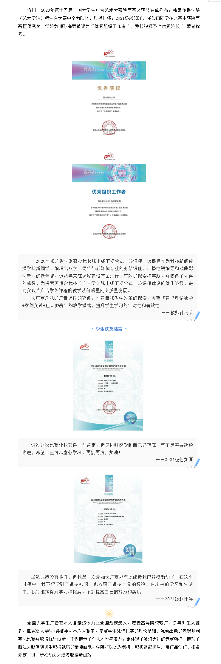 喜报!beats365唯一官方网站师生在2023年第十五届全国老员工广告艺术大赛获佳绩!
