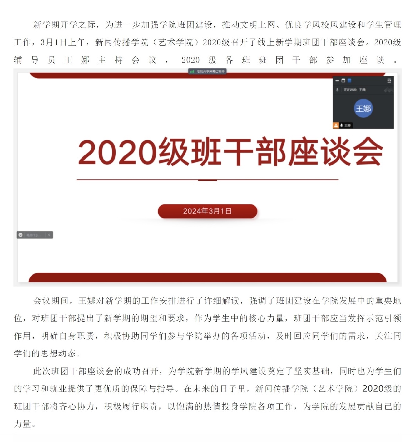 2020级召开新学期班团干部座谈会
