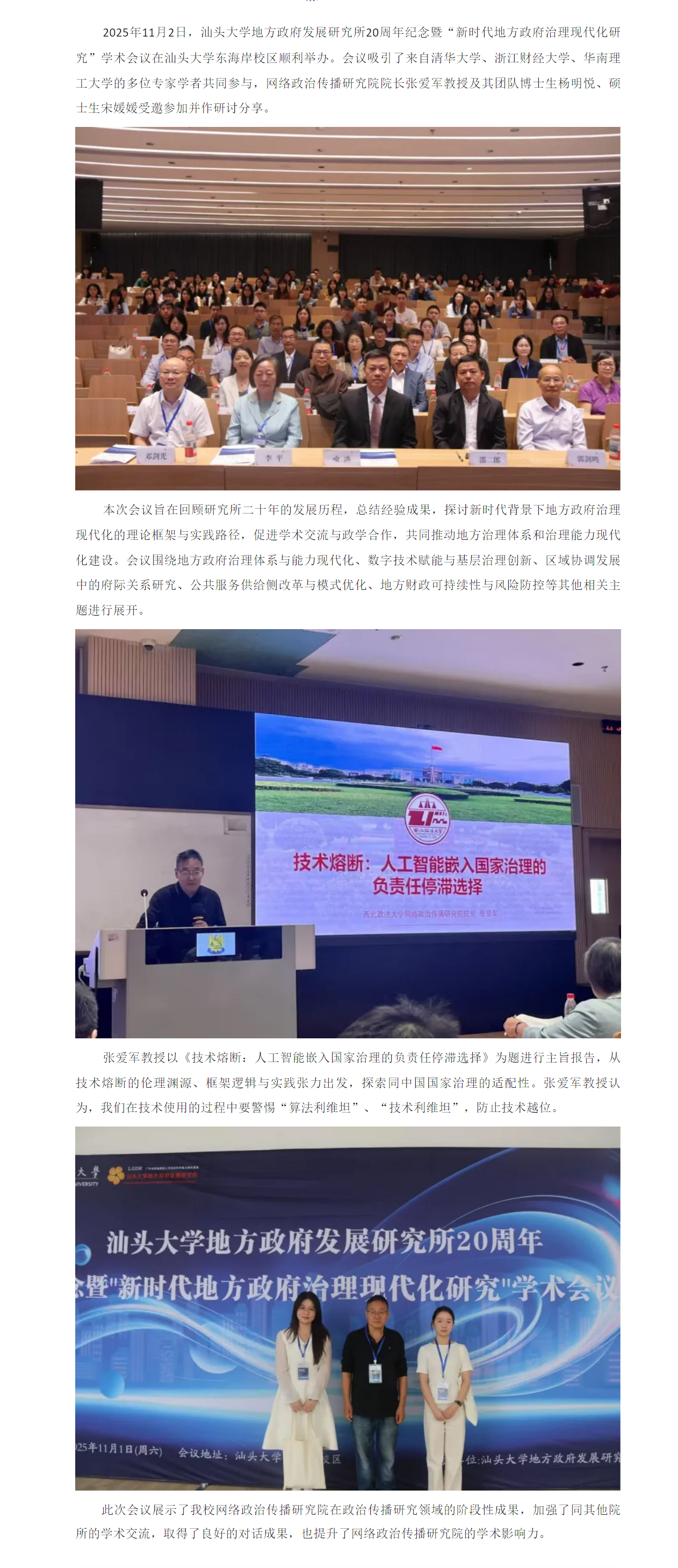 网络政治传播研究院经理张爱军教授及其团队员工参加汕头大学地方政府发展研究所20周年纪念暨“新时代地方政府治理现代化研究”学术会议
