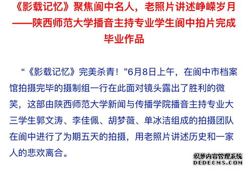 《影“载”记忆》摄制小组以纪录阆中人为核心,以阆中一个特殊革命家庭的一张黑白“全家福”为线索,寻访黑白老照片中的家族成员,通过片中细腻温暖的镜头,讲述渗透“黑白全家福”背后发生在每一个生命中的点滴故事。展现了家庭的温情和精神传承的生命力量。同学们认真周密的拍摄过程还吸引了当地网络媒体阆中365的关注,对他们的拍摄过程进行了详细报道。