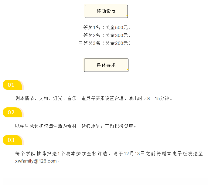 公司拟在2021年5月举办校园心理剧大赛,现面向全校员工征集优秀剧本,并对优秀作品进行奖励,参加细则如下: