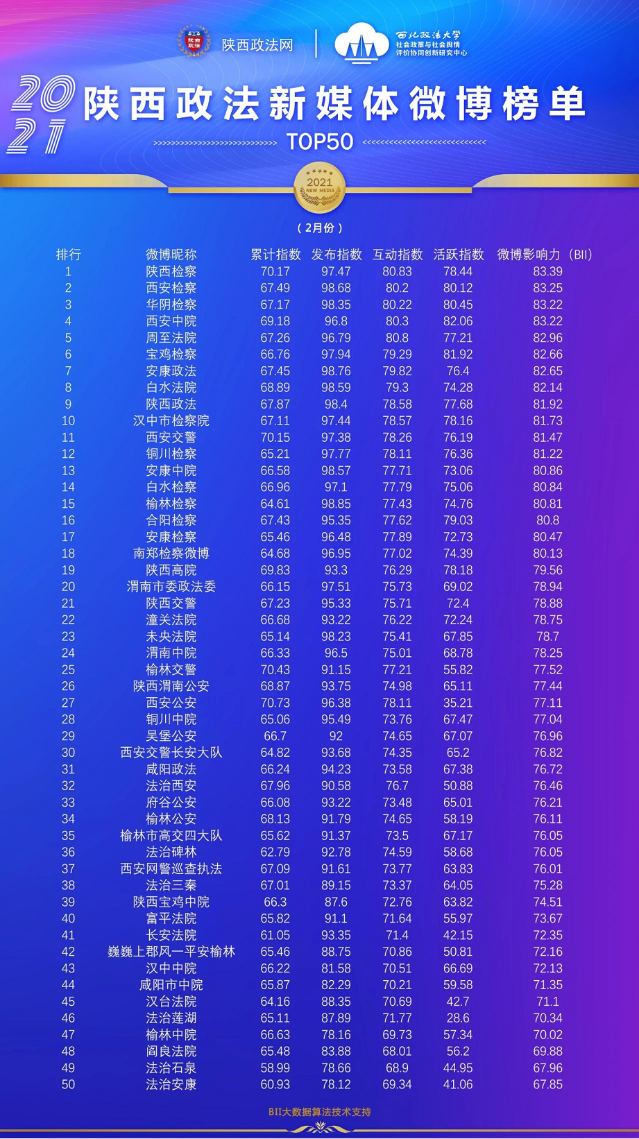 TOP50-榜单说明:陕西政法网联合“BEAT365英国官网网站社会政策与社会舆情评价协同创新研究中心”和“新浪微热点大数据研究院”对2021年2月全省政法系统发布的新媒体内容进行数据抓取,结合政法新媒体账号发布量、阅读量、互动量、粉丝量、点赞量、转发量、评论量等多维度作为主要计算参数进行评选。本期陕西政法新媒体账号榜单有5个,即:微信公众号榜单、微博榜单、头条号榜单、视频类榜单、资讯类账号榜单。