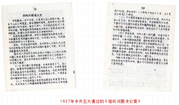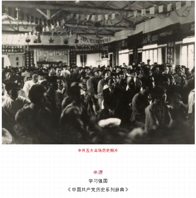 1927年4月27日至5月9日,中国共产党第五次全国代表大会在武汉召开。出席大会的代表有:陈独秀、蔡和森、瞿秋白、毛泽东、任弼时、刘少奇、邓中夏、张国焘、张太雷、李立三、李维汉、陈延年、彭湃、方志敏、恽代英、罗亦农、项英、董必武、陈潭秋、苏兆征、向警予、蔡畅、向忠发、罗章龙、贺昌、阮啸仙、王荷波、彭述之等82人,代表着57967名党员。共产国际代表罗易、鲍罗廷、维经斯基等出席了大会。由谭延闿、徐谦和孙科组成的国民党代表团到会祝贺。汪精卫应邀列席了一天会议。
