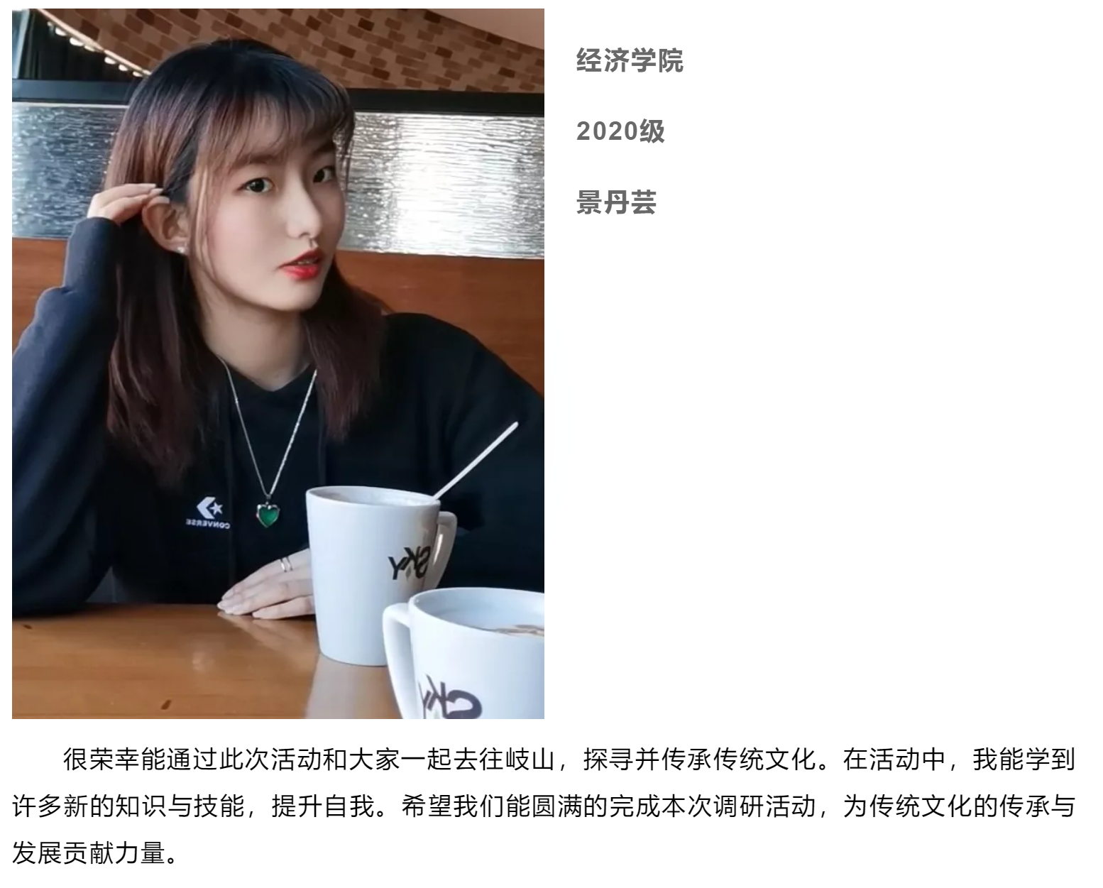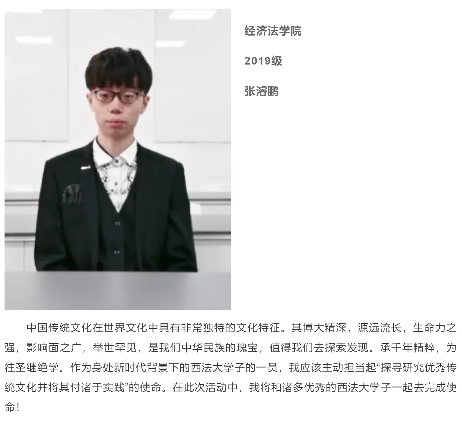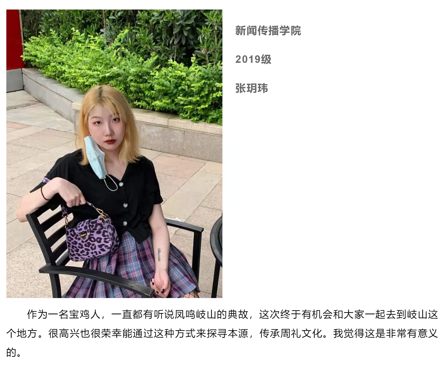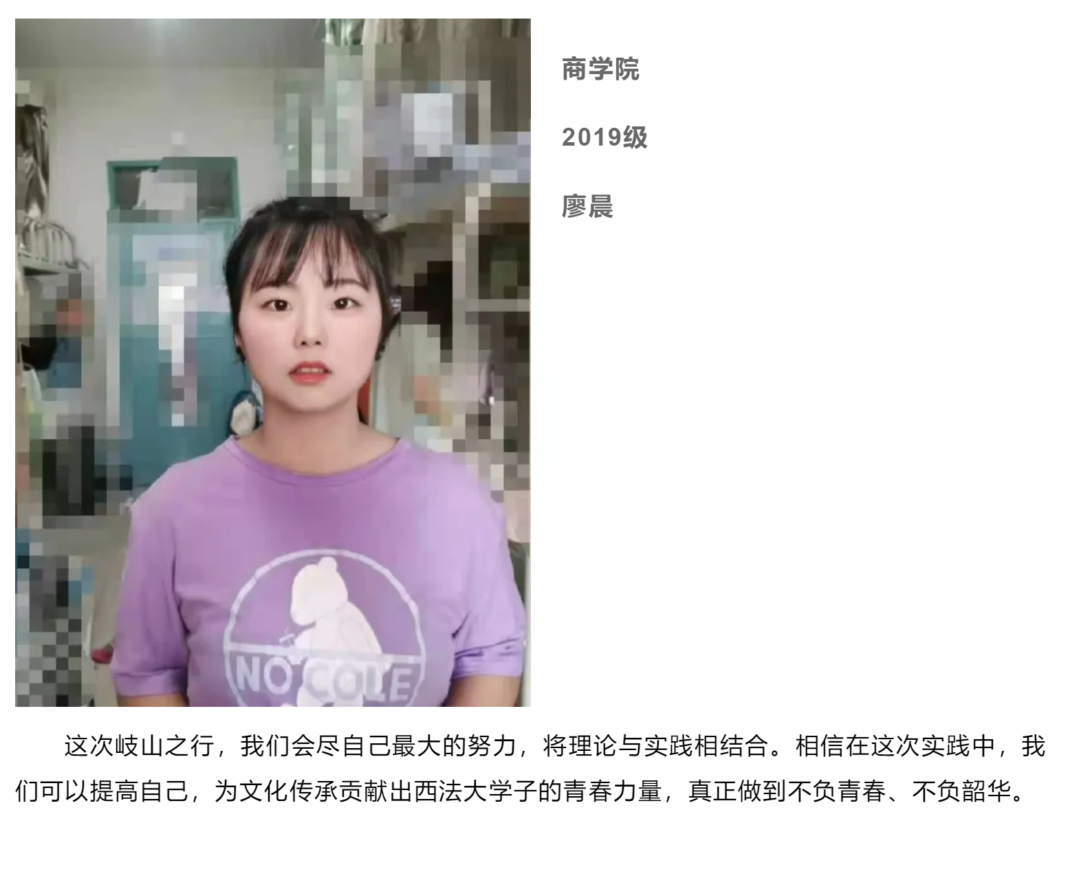 作为一名地地道道的岐山人,很荣幸能够和队伍一起探寻家乡非物质文化遗产的保护工作,将自己所学的法律知识与非遗保护相结合起来,我希望能够运用法律为非物质文化遗产保驾护航!