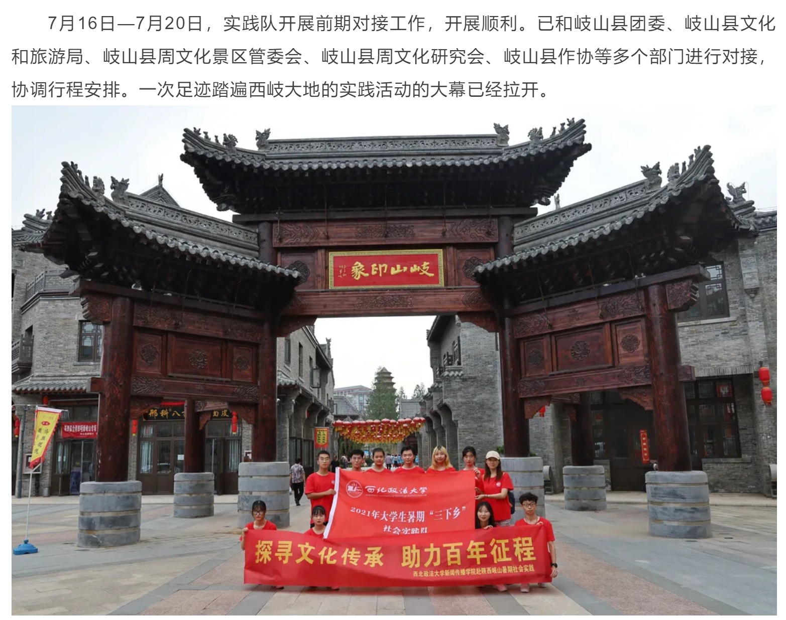 民族要复兴,乡村必振兴,青春助振兴。陕西岐山拥有深厚的周文化和民俗文化资源,形成了历史文化游、民俗文化游、廉政文化游、美丽乡村游的全域旅游新名片。best365英国在线体育官网暑期实践队通过对岐山文化资源开展调研,深入了解岐山文化传承、资源分布、社会反响等方面现状,依托新闻传播专业优势提升岐山文旅宣传质量,为进一步扩大岐山全域旅游知名度和影响力贡献智慧,为乡村振兴贡献西法大人的青春力量。